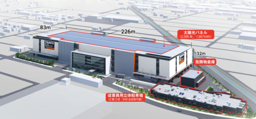 屋根面には3396枚の太陽光パネルを設置し、1867.8kwの自家発電能力を確保。建物には、商品の供給を止めないために、地震発生時にも建物の揺れを最小限にする免震構造を採用する。