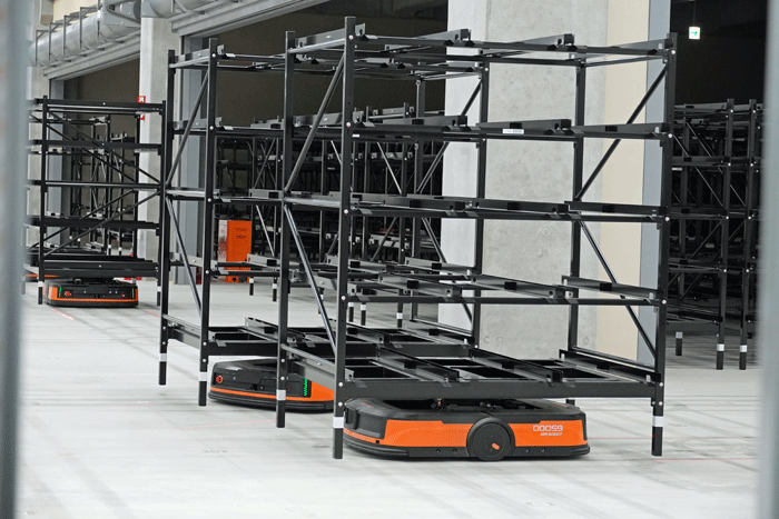 目玉となるのは、増築棟2階フロアにある「G2Pステーション」だ。同ステーションでは、同社のCMやカタログ表紙・見開き等の主力商品を集め、さらなる作業効率化を図る。オリジナルのAGVを133台導入し、2008棚を設置。保管能力は約90万点に及ぶ。作業者のいる場所まで対象となる荷物を運送するGTP(Good to person)システムを導入し、AGVが棚ごとに作業者がいるワークステーションまで搬送する。これによりピッキング作業者は歩くことなく、大幅な生産性向上を実現。また人員構成に変更はなく、計画出荷件数実現が可能となる。