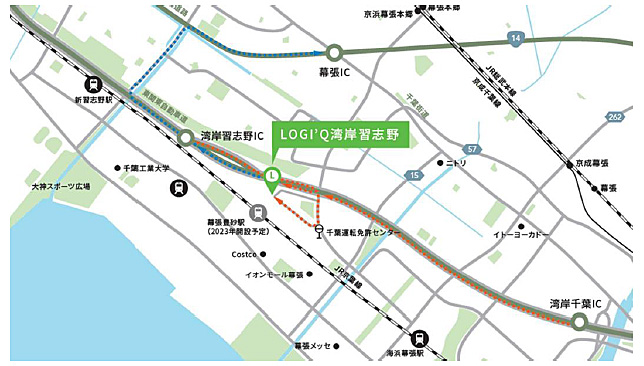 「LOGI’Q湾岸習志野」(8月31日竣工)は、首都高速湾岸線「湾岸習志野IC」から0.3km、京葉道路「幕張IC」から3.3kmと、首都圏の広域範囲にスピーディーにアクセスでき、近隣の住宅街からの人材確保もスムーズな立地。同施設が立地する千葉県美浜区は、2023年3月に幕張豊砂駅が新設されたことで、さらなる人口集積が見込まれている。