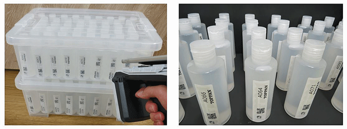 <液体の入った樹脂容器を高出力ハンディリーダやスマートシェルフリーダで一括読取りを行うイメージ(汎用広指向性モデル)>