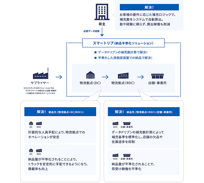 NTTロジスコは9月28日、店舗や事業所等への納品量を平準化し、物流の2024年問題への対策強化を支援する「スマートリプ(納品平準化ソリューション)」を提供開始したと発表した。