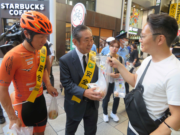 秋の全国交通安全運動は、広く国民に交通安全思想の普及・浸透を図り、交通ルールの遵守と正しい交通マナーの実践を習慣付け、交通事故防止の徹底を図ることを目的に行なわれている。今回の街頭活動は、通行中の歩行者や自転車の運転者に交通安全グッズと「交通事故なし」の願いを込めて400個の梨を配り、交通事故防止や自転車のヘルメット着用を呼びかけた。