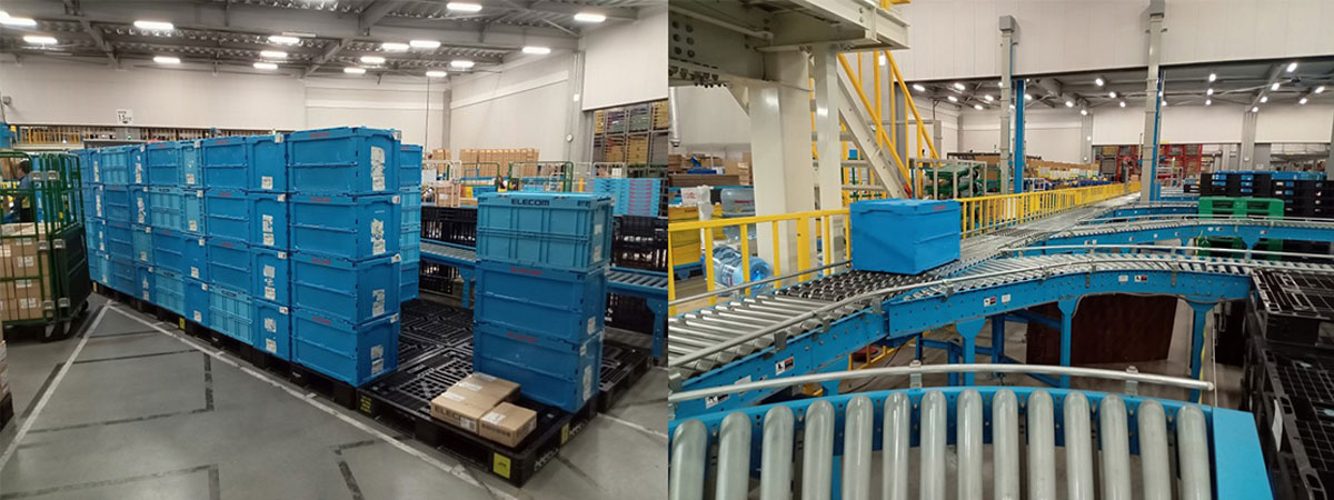 コクヨサプライロジスティクス社への製品納品時に使用した折りたたみコンテナはエレコムにて回収し、次回以降の納品で再度使用する「リターナブル運用」を採用している。この取り組みにより、1年あたり約2000個分の段ボール資材を削減できる見込みとなっている。