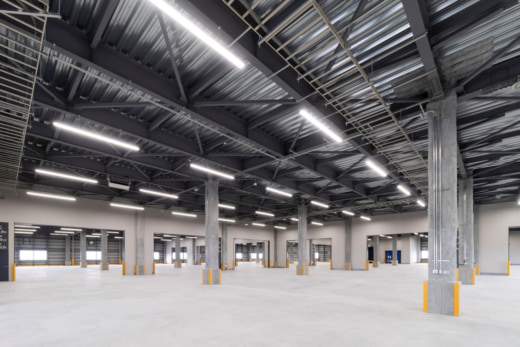 倉庫部分は、床荷重1.5t/m2、有効高さ5.5m以上を確保し、照明は全てLED照明を採用。また、荷物用EV、垂直搬送機をそれぞれ2基ずつ、ドックレベラーは4台実装している。
