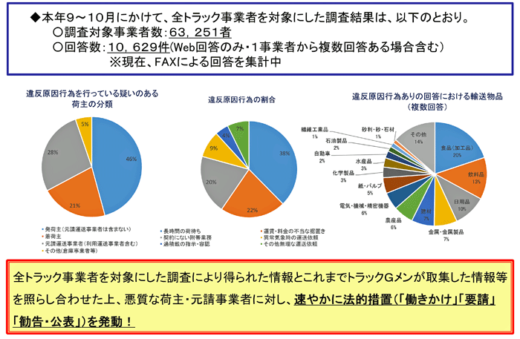 トラックGメンは、トラック事業者への積極的な情報収集のほか、貨物自動車運送事業法に基づく「働きかけ」などを全国で実施している。9月~10月にかけて実施した全トラック事業者を対象にした調査では、長時間の荷待ちや運賃・料金の不当な据置きなどを強いる荷主等の情報が多数寄せられた。