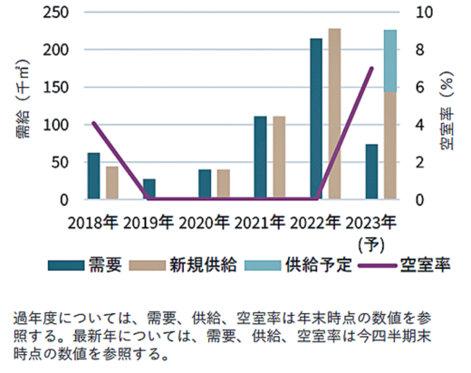 賃料は、月額坪当たり4579円で前期比0.8%の上昇、前年比1.0%の上昇。ベイエリアは新規供給の高い賃料水準により前期比2.1%の上昇、内陸エリアは前期比横ばいとなった。賃貸市場では供給の増加により空室率が高止まりしているが、2024年以降供給が減少する見込みで、将来的な空室率低下が予想される。