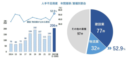 帝国データバンクは11月14日、人出不足倒産の動向を分析し、2023年10月時点で累計206件が発生、そのうち建設/物流業が占める割合は52.9%で半数以上になったと明らかにした。