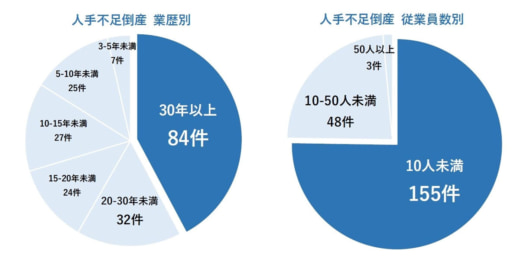人手不足倒産について内訳をみると、業歴別では約4割にあたる84件が「30年以上」だった。長い業歴を有しているなかでも、人手不足が引き金で倒産するケースは多い。また、従業員数別では約75%が「10人未満」の企業で占められている。小規模事業者では、1人の退職ダメージが大きいことが原因と考えられる。