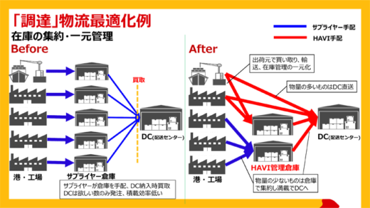 「調達」物流について従前は、サプライヤーが倉庫を手配しDC納入時に買取りしていた。DCは欲しい数のみ発注し、トラックの積載効率も低かったが、これをHAVI社が出荷元で買取り、輸送、在庫管理までを一元化した。物量の多いものはDCへ直送し、物量の少ないものについては倉庫で集約し、満載でDCへ届けることで輸送効率を向上した。