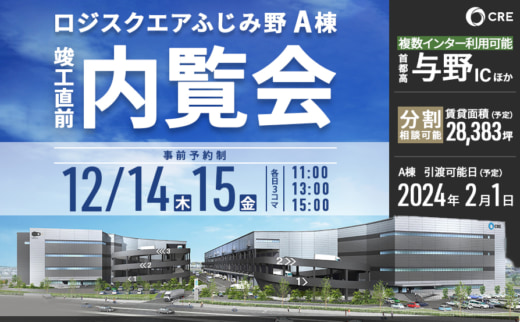 シーアールイーは12月14・15日の2日間、埼玉県ふじみ野市で開発中の物流施設「ロジスクエアふじみ野A棟」の竣工直前内覧会を開催する。