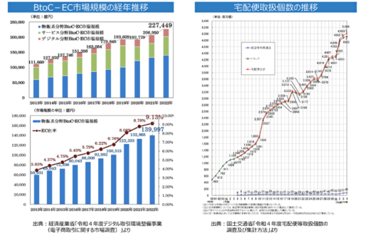 また、ECの拡大に伴い宅配便の取扱個数は約50億個(2022年度)となっている。このため、宅配事業者の負担が増えており、今年6月に関係閣僚会議で取りまとめられた「物流革新に向けた政策パッケージ」では、2024年度に再配達率6%を目指すことが盛り込まれている。
