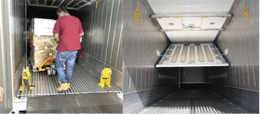 異なる温度帯に対応するため、コンテナ庫内中央部に開閉可能な間仕切りを備えており、冷凍機に近い側は-30℃から+30℃、もう一方は-5℃から+30℃までの温度帯に対応する。間仕切りは前後に動かすことができ、庫内の広さを調整できる。