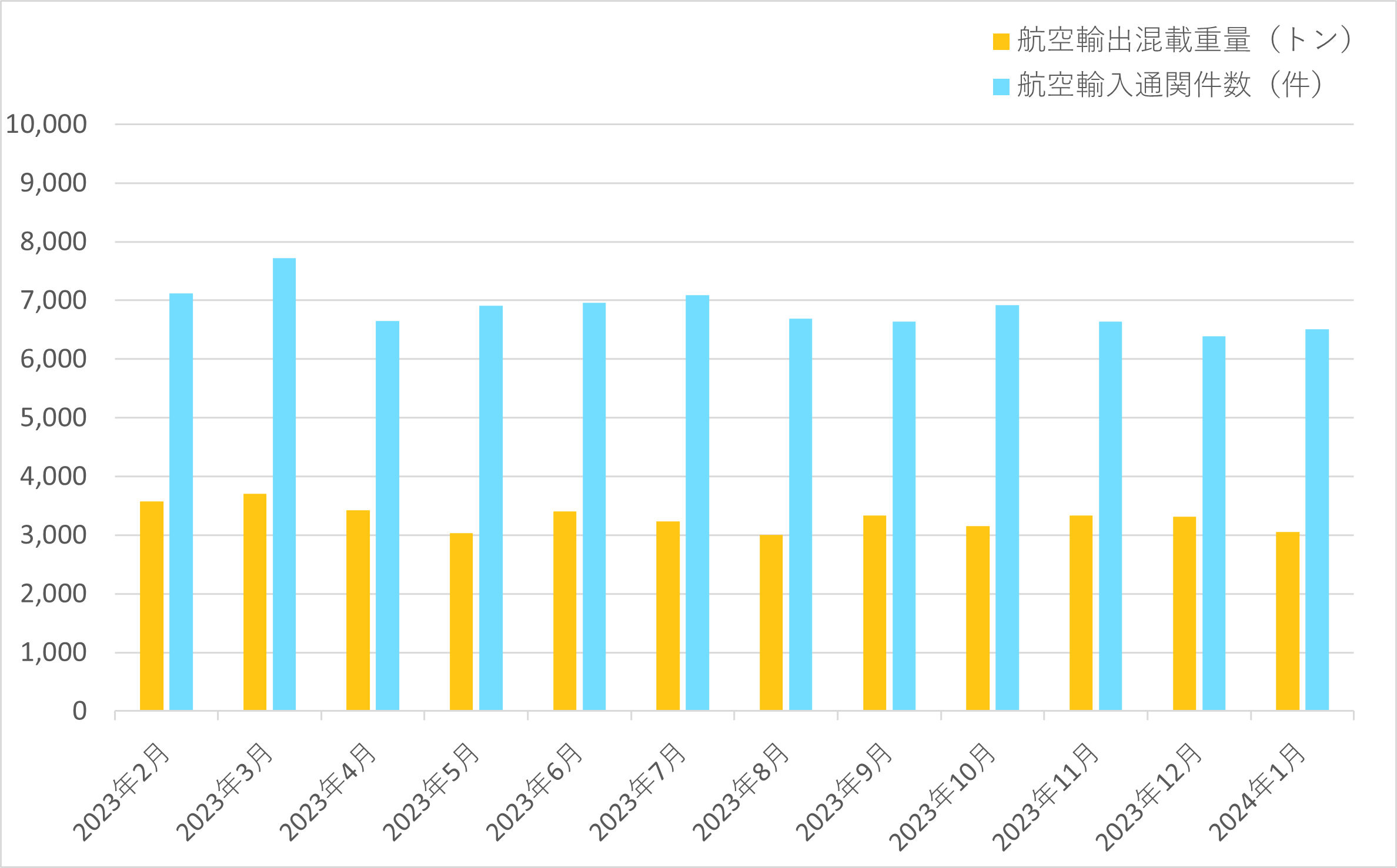 西日本鉄道が2月8日に発表した1月の航空貨物取扱実績によると、航空輸出混載重量は3057トン(前年同月比2.7%減)、日本着航空輸入通関件数は6505件(3.4%減)となった。