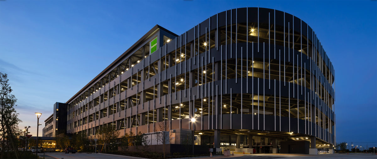 「グッドマン常総」の建物スペック面の特長も物流施設としての優位性に寄与している。まず、敷地内カスタマー用に700台の駐車スペースを確保していることが大きなポイントだ。そして常総エリアは地域住民の足となる自家用車通勤が多くなることから、これだけのスペースを確保したもの。雇用確保の面からも有利な環境となる。これは、1フロア当たり140台を駐車できる計算になる。トラック出入口と通勤用乗用車出入口を分離していることで運用に支障なく、安全な通勤動線を確保している点も魅力である。