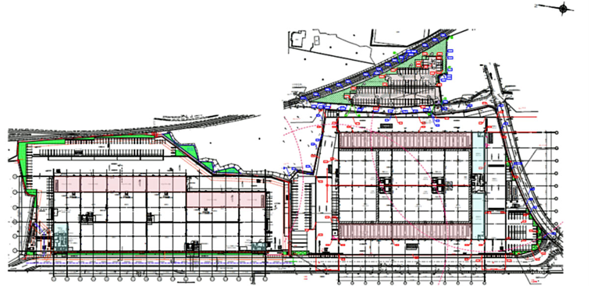 物件敷地(約4万7110m2)を南北に分けた2棟の物流施設を計画しており、開発敷地内には大型トラックやトレーラーが通行可能な道路を整備する。