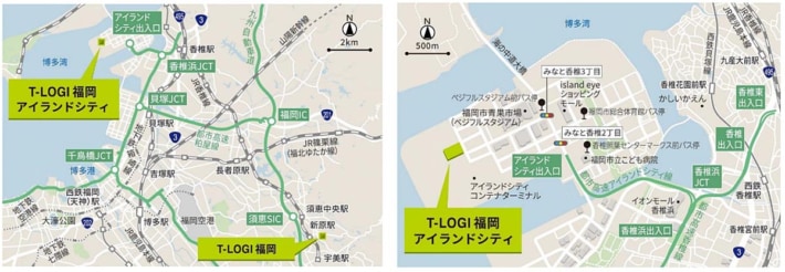 福岡高速6号線「アイランドシティ」出入口から1.4kmに位置し、福岡市内への配送に加えて、九州全域への広域配送、本州と九州を繋ぐ配送の拠点としても適した環境に立地している。