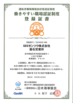 SBSゼンツウは3月21日、国土交通省が創設した「働きやすい職場認証制度」において、2月29日に同社釜石営業所が「三つ星」を取得したと発表した。