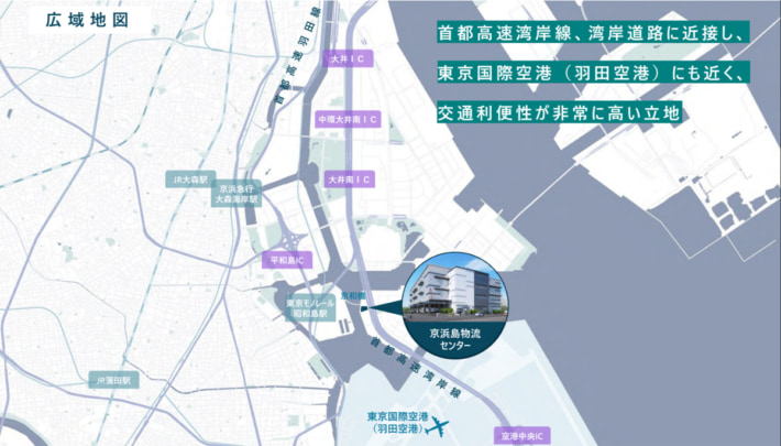 同物件は、首都高速羽田線「平和島IC」から5.0km、首都高速湾岸線「空港中央IC」から4.0㎞の場所に位置しており、羽田空港貨物ターミナル(4km、車で8分)や東京港にもアクセスが良好な立地。また、東京モノレール「昭和島駅」から徒歩13分で、JR「大森駅」から多数のバスが巡行しており、通勤利便性も兼ね備えている。