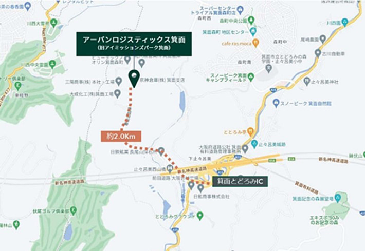 アーバンロジスティックス箕面は、新名神高速道路「箕面とどろみIC」から2km地点に位置し、新名神高速道路の全線開通により今後さらなる広域アクセスの向上が見込まれている。また、大阪市内中心部まで30分圏と消費地へのアクセスも良好で、365日24時間稼働可能な産業団地内にあることから、立地企業間での連携も期待できる。