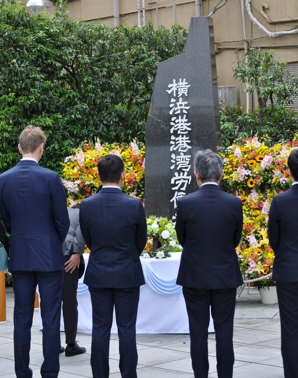 また、当日は式典に先立ち、両社の代表者らが、横浜港で亡くなった労働者に敬意を表し、横浜港港湾労働者供養塔で献花を行った。