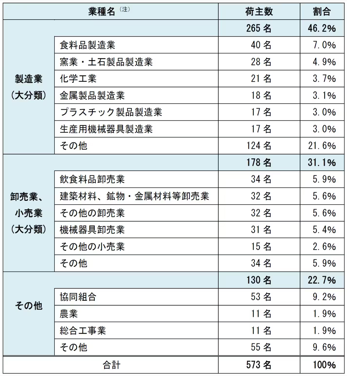 注意対象となった業種と件数は、「協同組合」(農産物の販売事業等を営む協同組合)3件、道路貨物運送業2件、食料品製造業2件、プラスチック製品製造業2件、金属製品製造業2件などとなっている。