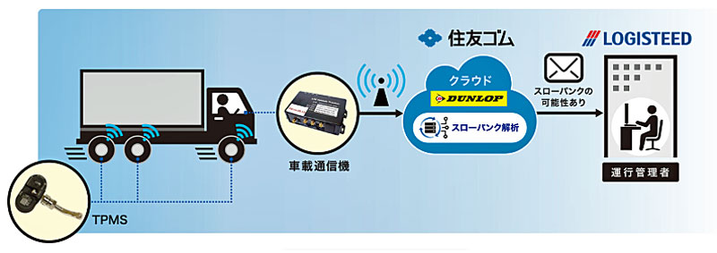 グループが保有する車両へ、住友ゴムのタイヤ空気圧や温度をモニタリングして異常を知らせる「タイヤ空気圧・温度管理サービス」を導入し、トラックの稼働率向上に向けた実証実験を開始したもの。