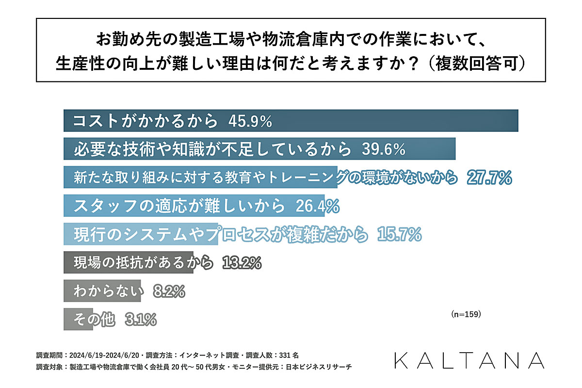 それによると、製造工場・物流倉庫で働く人の約75%が生産性の向上を実感していない。製造工場・物流倉庫内の作業で生産性の向上が必要と考えるひとが過半数。生産性向上のための施策は「作業環境の改善」と「安全性の向上」につながる。生産性向上のためのネックとなっているのは「コスト」、次いで「技術や知識の不足」。生産性向上に効果的なのは「システムやツールの導入」と「作業プロセスの見直し」、「生産性を上げるためのシステムやツールの導入」は結果的にコスト削減につながる、等の結果となった。