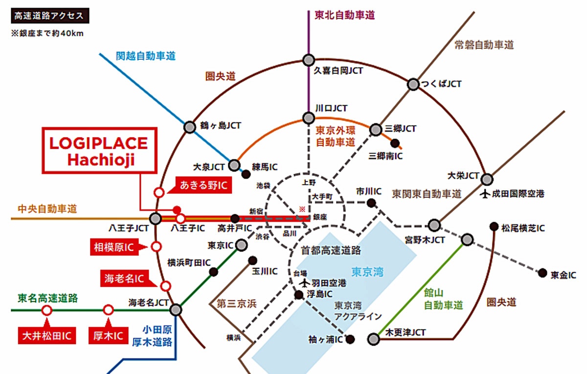 「LOGI PLACE八王子」の特徴は、空調設備だけではない。立地や雇用面でも優位性を誇る。「八王子ICから近く、国道16号にも近く、関東周辺の配送にはまさに適地です。八王子ICまではわずか1.4㎞の近さです。東京都市部および 23 区西部から東京都心部、さらに埼玉県中西部や神奈川県平塚市までを含む約1180万人をカバーできる広域配送拠点」と高橋シニアマネージャーは物流適地であることを強調する。また、一般道のみを利用した場合でも、埼玉県入間市周辺から神奈川県厚木市まで約340万人をカバーできるという。