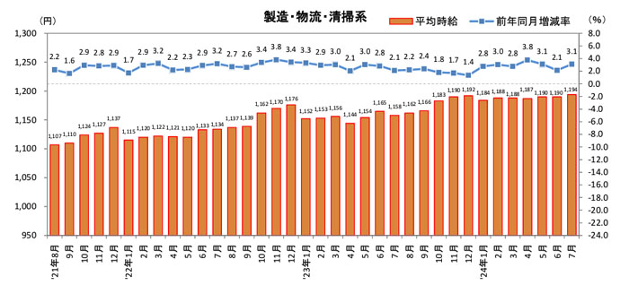 また、首都圏での製造・物流・清掃系の平均時給は1226円(2.8%増)で、ドライバー・配送・デリバリーは1211円(2.4%増)、ドライバー中型・大型が1295円(4.8%増)、物流作業が1241円(3.2%増)、構内作業・フォークリフトが1430円(2.1%増)となっている。