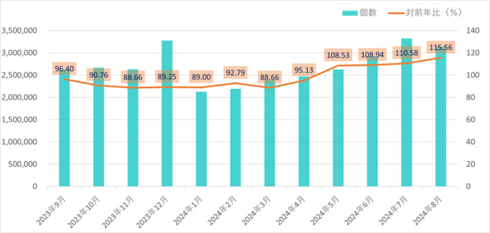 航空貨物運送協会が9月26日に公表した8月の国内宅配個数は、313万6837個(前年同月比15.56%増)となった。