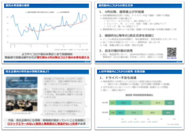 具体的には、運賃水準指標の推移、運賃動向とこれからの荷主交渉、人材市場動向とこれからの採用・定着活動、行政動向・トラックGメンの働きかけ実績といった内容だ。