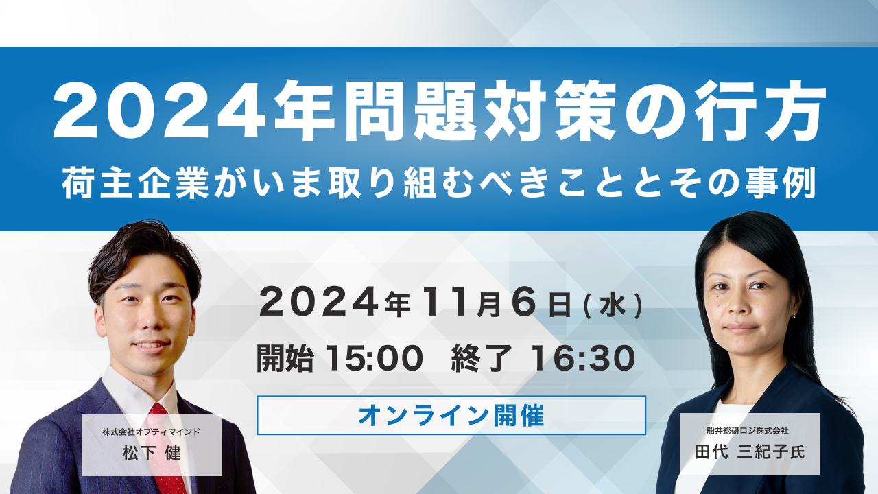 オプティマインドと船井総研ロジは11月6日、「2024年問題対策の行方~荷主企業がいま取り組むべきこととその事例~」と題しオンラインセミナーを開催する。