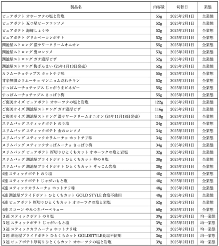 湖池屋は11月11日、一部製品について、価格・規格改定を実施すると発表した。