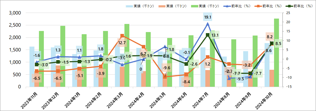 10月は国内景気が引き続き緩やかな回復にあるものの、食料品を中心に商品値上げ等もあり個人消費の改善には足踏みが見られた。一方、一部貨物列車で編成両数を減らして運行したものの、物流の2024年問題やカーボンニュートラルの実現に向けた動きを背景に、鉄道利用は堅調に推移し、輸送実績は前年を上回った。