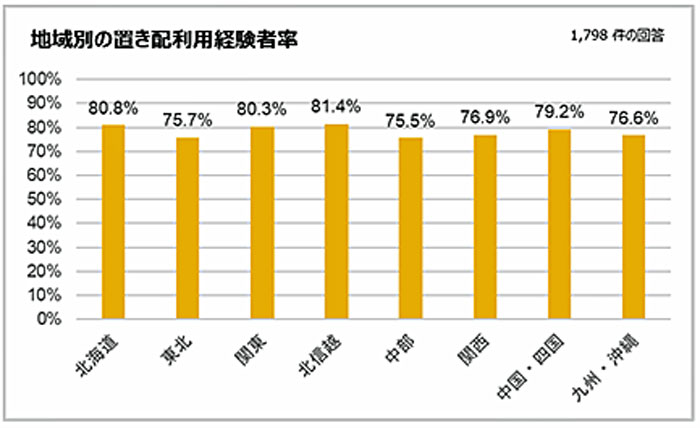 各地域別では「これまでに置き配を利用したことがある」と回答した人の割合は75.5%~81.4%と、大きな差は見られなかった。地域にかかわらず、全国的に置き配の利用がされていると考えられる。