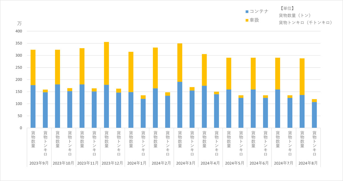 国交省/8月の鉄道貨物数量3.8%減、貨物トンキロ11.0%減