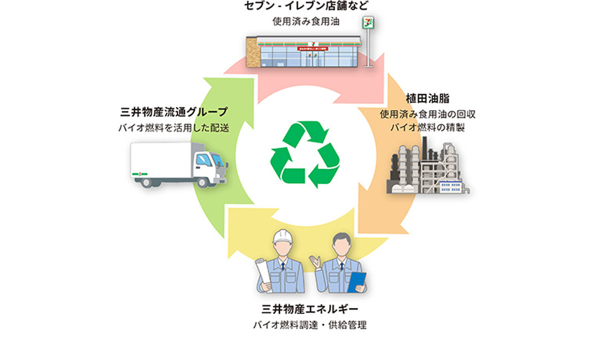 大阪府や京都府などのセブン-イレブン約1500店舗などから回収した使用済み食用油より高純度B100燃料を精製、三井物産流通グループが運営する「フローズン神戸センター」の配送車両に給油し、大阪方面のセブン-イレブン店舗へ配送を行う。