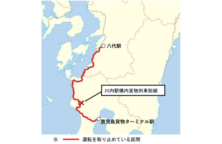 日本貨物鉄道(JR貨物)は12月25日、鹿児島線川内駅構内貨物列車脱線事故に伴う運転中止について、貨物列車の運転再開予定を公開した。
