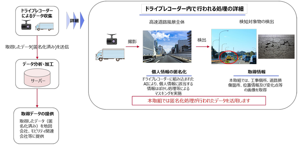 人の顔やナンバープレートなど個人情報は匿名化したうえで、工事現場や道路の損傷を示す画像と位置情報を取得し、データを地図会社やモビリティ関連会社へ提供する。
