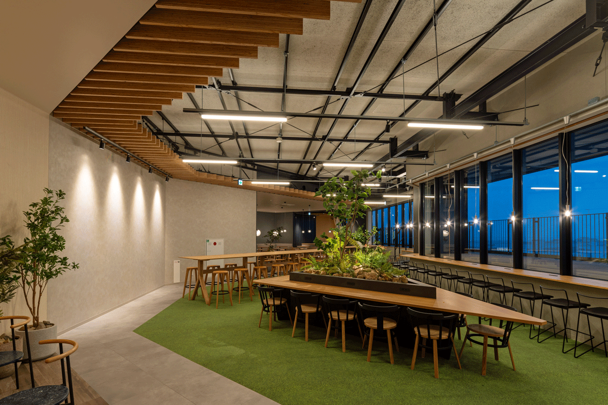 環境面では、廃材をリサイクルしたタイルなどの建材を施設各所に採用。共用棟を木造建築とすることで約71t、共用棟内のカフェテリアで京都府内の森林から伐採した木材を使用した家具を採用するなど、約1.9tの二酸化炭素貯蔵を実現。カーボンニュートラルに貢献する。このほか全館LED 照明、人感センサー、節水型衛生器具を採用し、環境や省エネルギーにも配慮している。今後太陽光発電システムの導入予定だ。