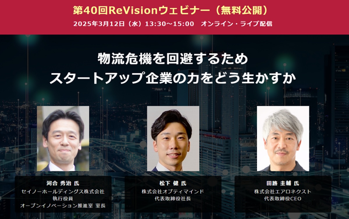 次世代モビリティや物流の分野で情報交流・人的交流を促進するメディアプラットフォーム「ReVision Auto&Mobility」(運営:InBridges)は3月12日、第40回ReVisionウェビナー「物流危機を回避するため、スタートアップ企業の力をどう生かすか」を開催する。