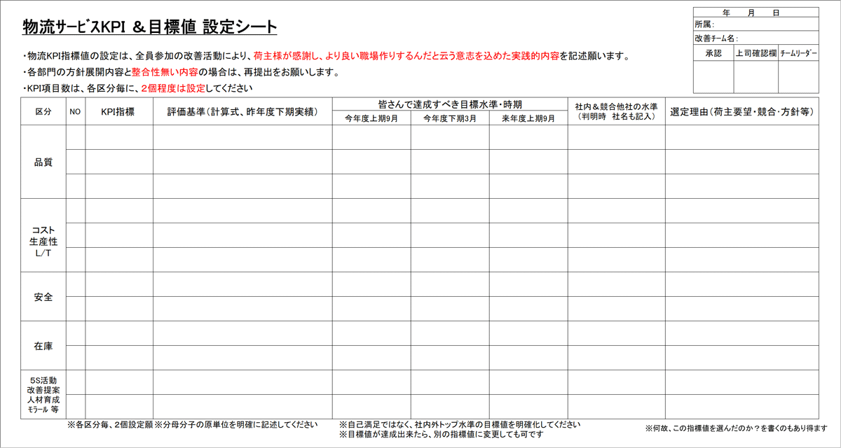 改善提案サークルごとに私も検討会に参加します。どのようなKPI指標が適切か。算出式? 過去の実績値? 今後どれぐらいの水準値が狙えるか(目標値への考え方)? 競争意識を喚起するため社内他部門はいかほどの水準? 荷主に対する競合他社とのベンチマーク比較水準値? などを意見交換しました。
