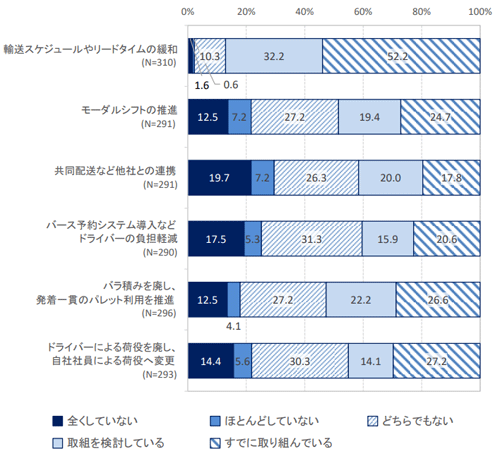 特に、「共同配送など他社との連携」や「バース予約システム導入などドライバーの負担軽減」など自社での完結が難しい取組や費用が発生する取組に関しては、実施されていない割合が比較的高い傾向にある。
