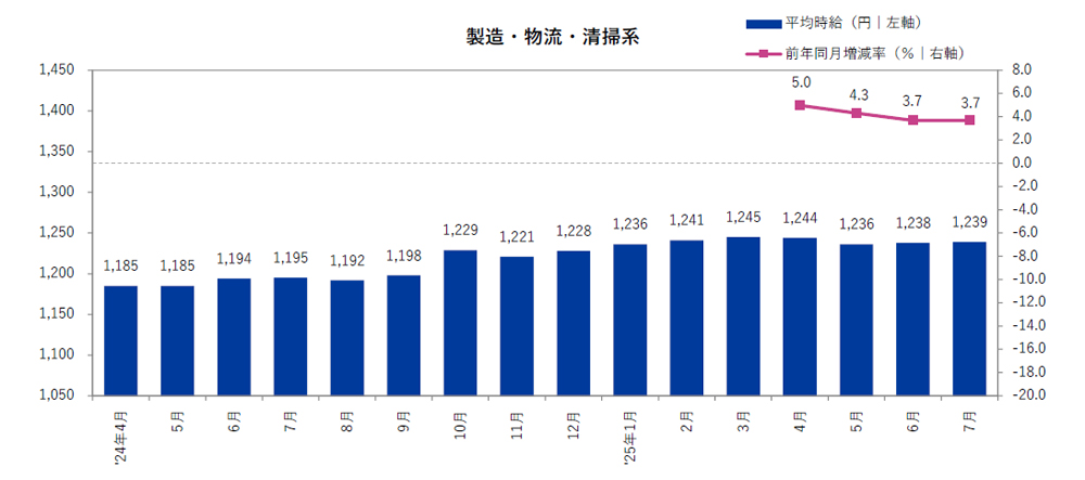 三大都市圏の製造・物流・清掃系の平均時給は1239円(前年同月比3.7%増)で、そのうちドライバー・配送・デリバリーは1233円(2.3%増)、ドライバー中型・大型が1309円(1.6%増)、物流作業が1239円(1.7%増)、構内作業・フォークリフトが1220円(1.7%増)だった。