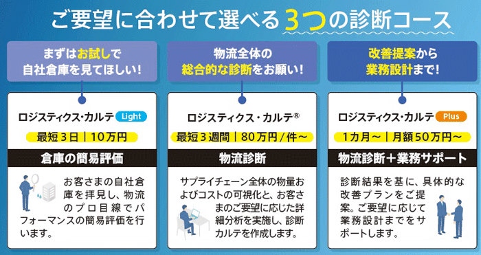 「ロジスティクス・カルテLight」は、倉庫運用の実態について60項目を5段階評価で診断し、現場視察を含めて最短3日で結果を提示するスピード診断サービス。