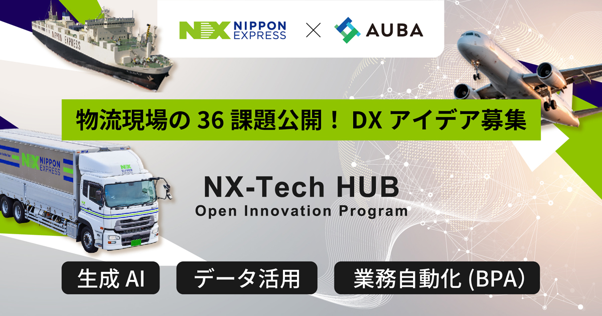 NIPPON EXPRESSホールディングスは9月16日、eiiconが運営する日本最大級のオープンイノベーションプラットフォーム「AUBA(アウバ)」で、陸海空の物流現場を起点に革新を起こすプログラム「NX-Tech HUB Open Innovation Program」を立ち上げ、“業務DX・業務効率化”などをテーマに、共創による事業アイデアの公募を開始した。AUBAを通じたNXHDのオープンイノベーションへの取り組みは、今回が初。
