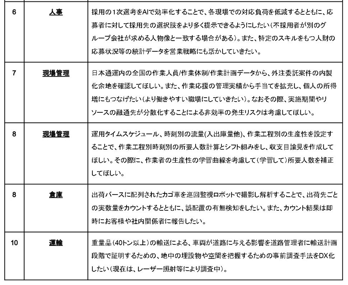 募集テーマは、36の物流現場の課題に対するDXのアイディアで、具体的な課題と解決の方向性は次の通り。
