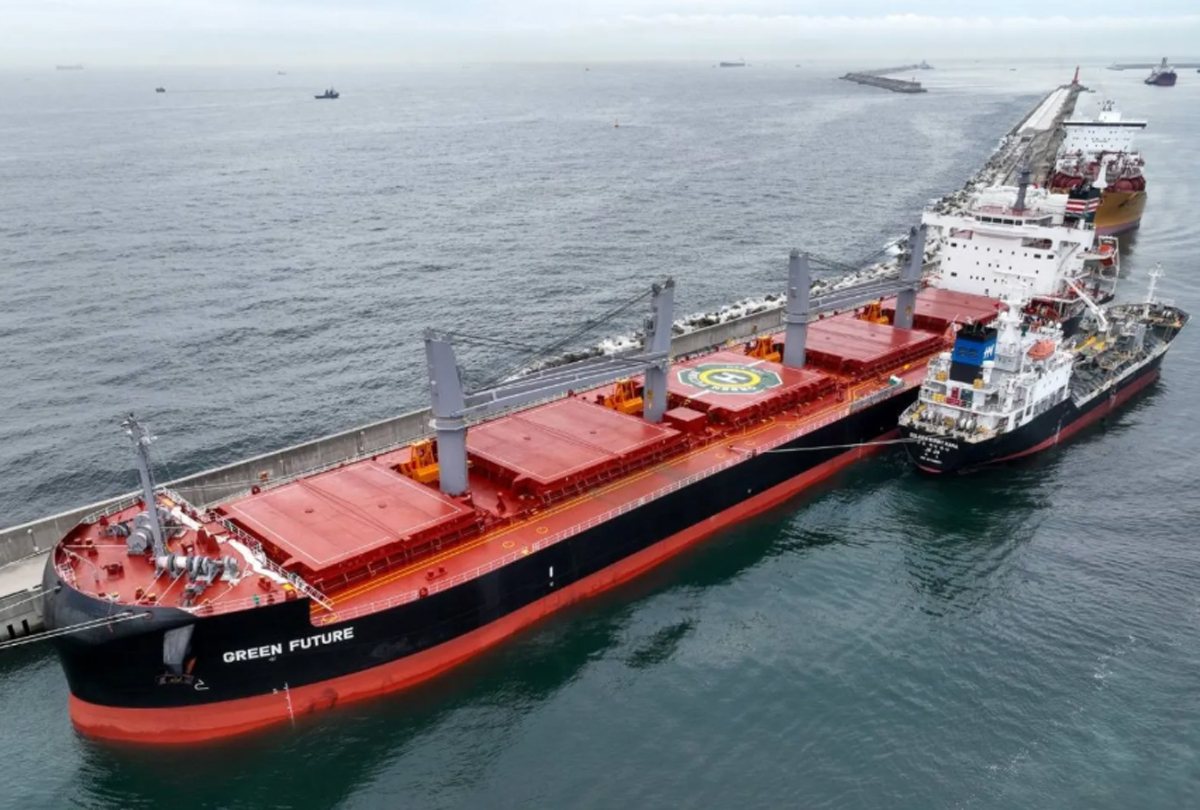 日本郵船グループのNYKバルク・プロジェクトが神原汽船から定期傭船するメタノール二元燃料ばら積み船「Green Future」が9月28日、韓国の蔚山港で燃料の低炭素メタノールを、バンカリング船からホースで直接燃料を受ける「Ship to Ship方式」で補給した。