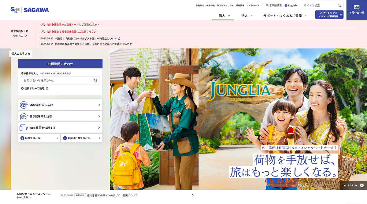 佐川急便はwebサイト総合トップのデザインを刷新、さらに個人向けサイトトップと、法人向けサイトトップを新たに創設した。