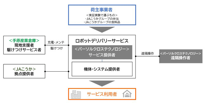 パーソルクロステクノロジーは自動配送ロボットの選定やシステム開発、運行管理、遠隔監視を担当し、JAこうかは弁当や食品などの荷主として参画し、地域拠点を提供する。